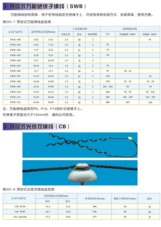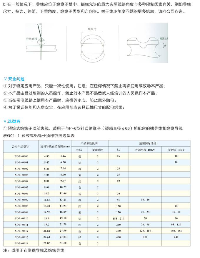 在一般情况下, 导线应位于绝缘子槽中,绑线允许的实际线路角度与多种限制因素有关,例如导线尺寸、拉力、跨距、下垂角度、绝缘子类型和方向等。关于线小角度问题的更多信息,请向公司咨询。